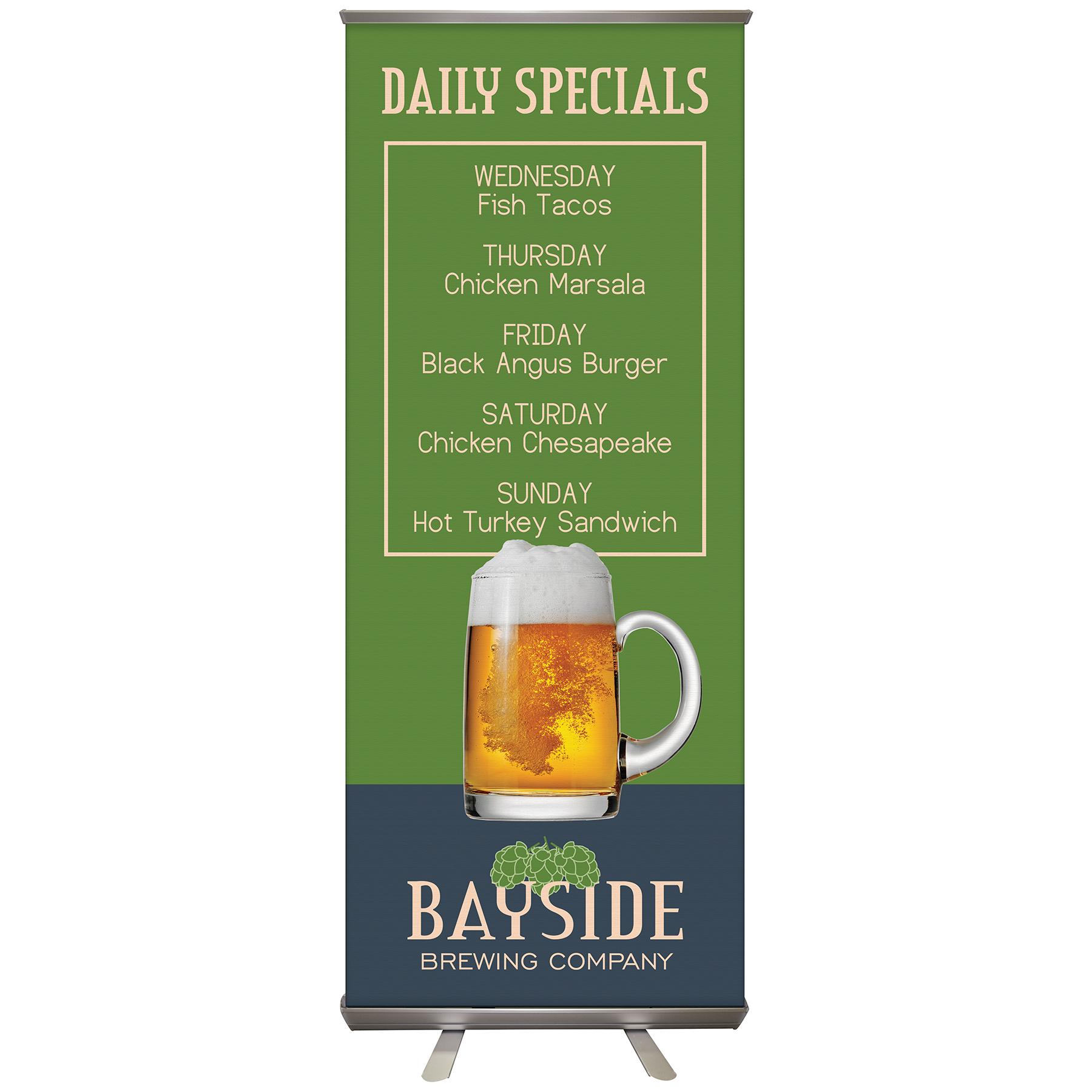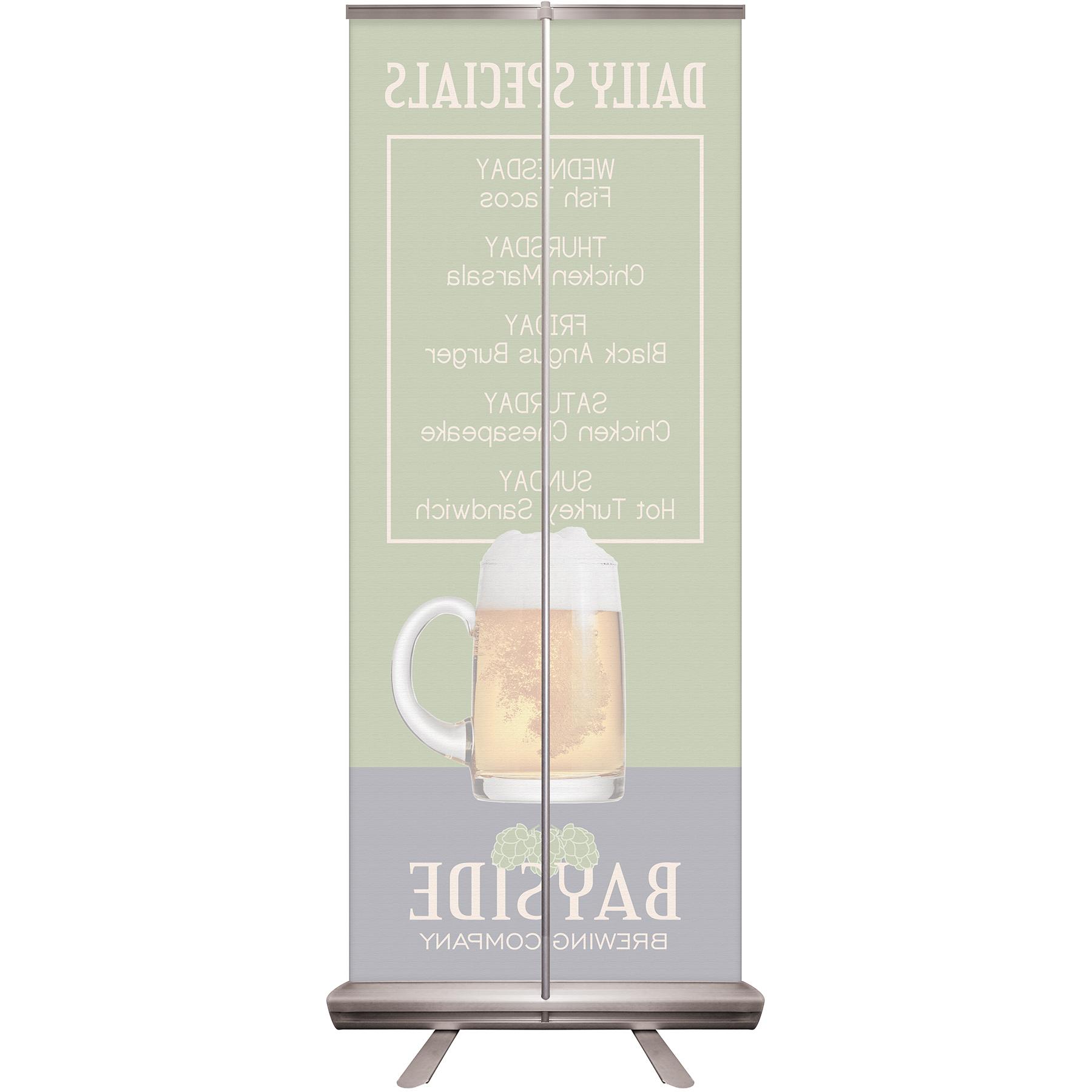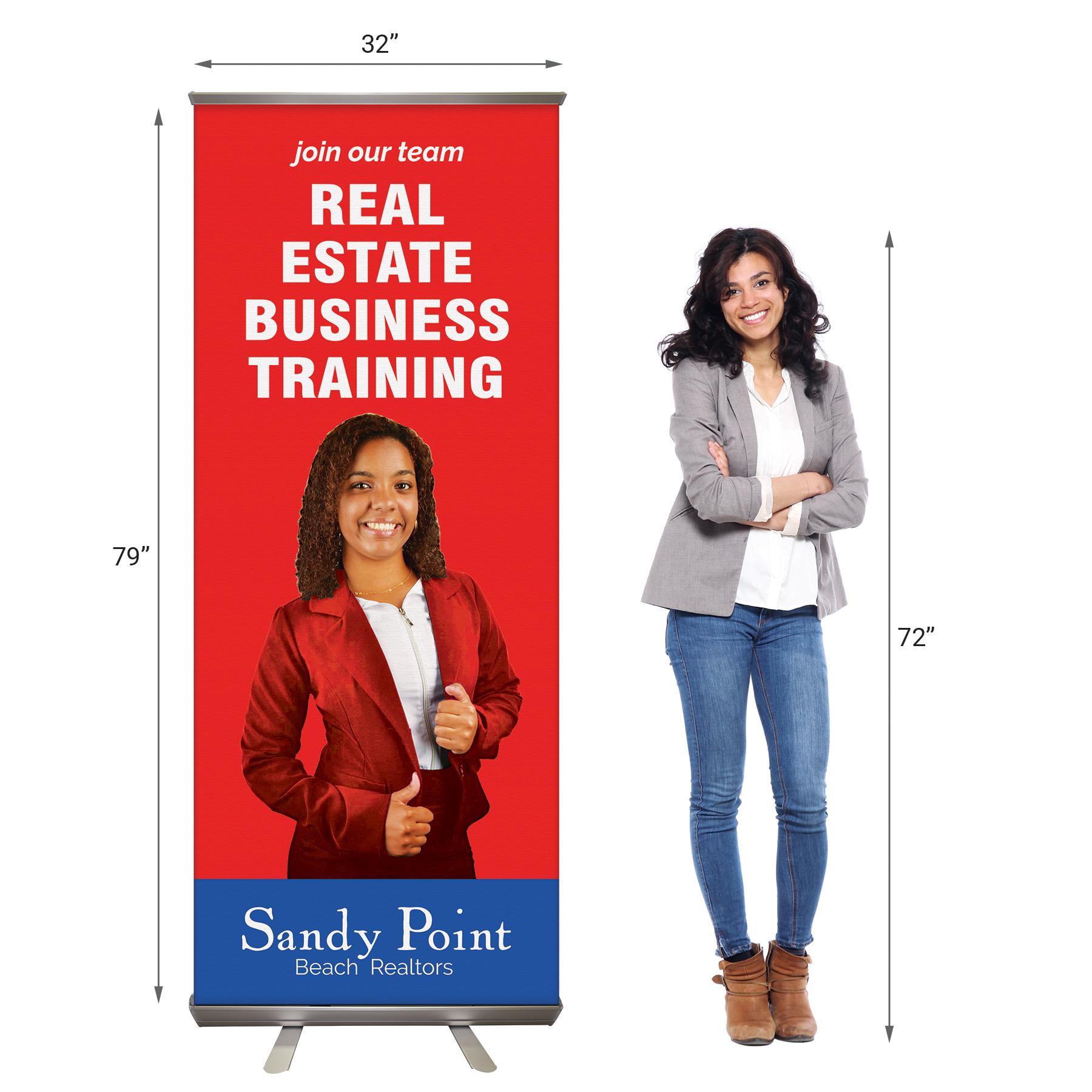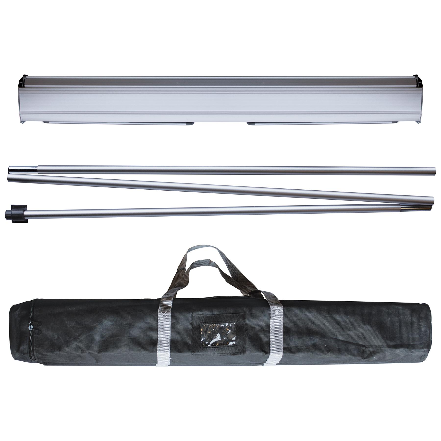 This sleek and stylish banner stand is the best value retractable frame anywhere! Assemble without tools and features a satin silver finish. These are great for trade shows, events, POP displays and other marketing and display applications. Instant set-up and take down. Sectional pole system, durable aluminum construction with adjustable tension. Includes soft travel bag.