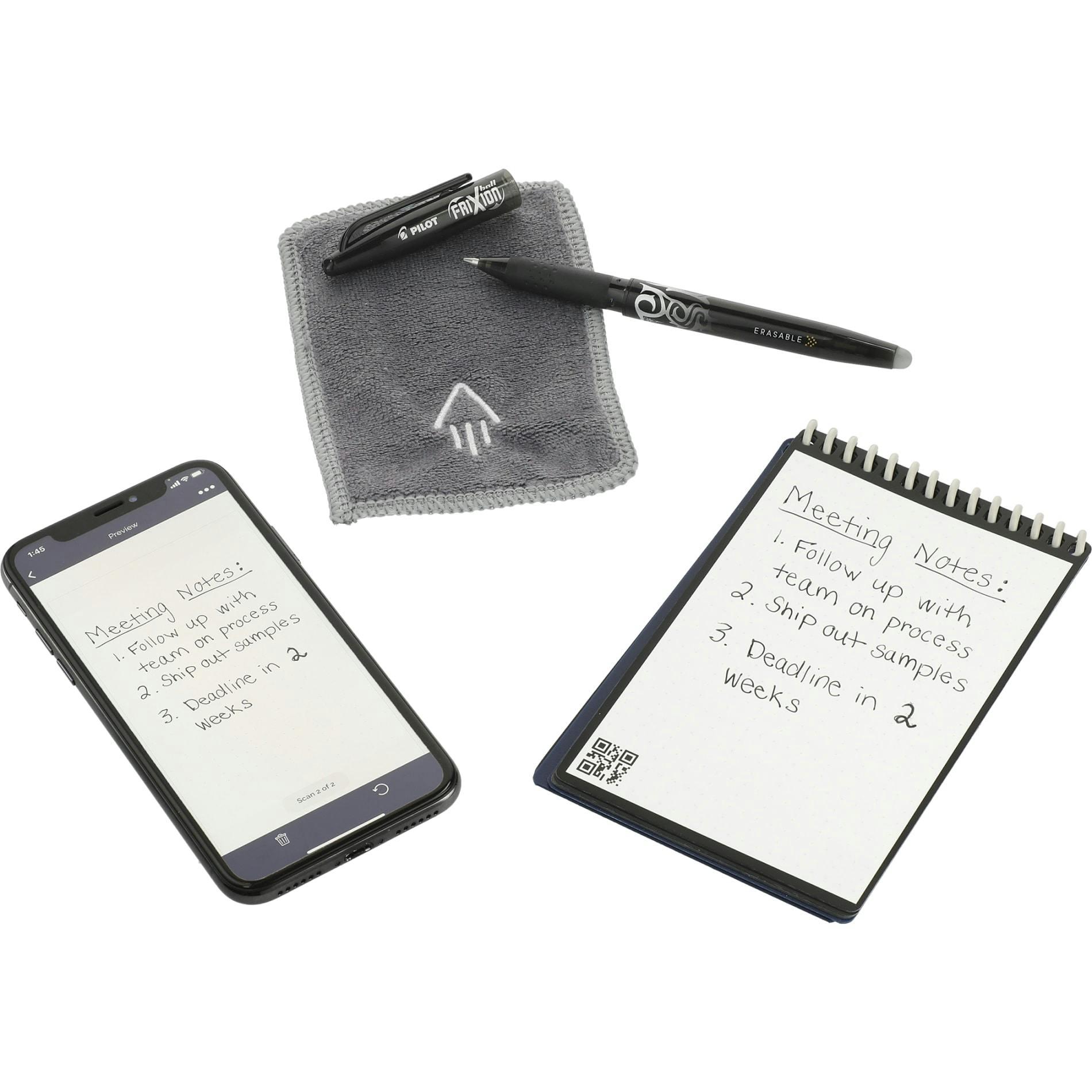 The Rocketbook Mini Notebook is designed for every classroom, office, and personal mission. The synthetic dotted paper allows you to write smoothly with a Pilot Frixion pen, then magically wipe clean with the included microfiber cloth when damp to reuse again and again! Use the Rocketbook app to blast your notes, plans, lists, and big ideas to your favorite cloud service for proper organization. Then, erase and reuse your Flip for your next adventure. This hard cover notebook contains 48 pages. Premium retail gift box.