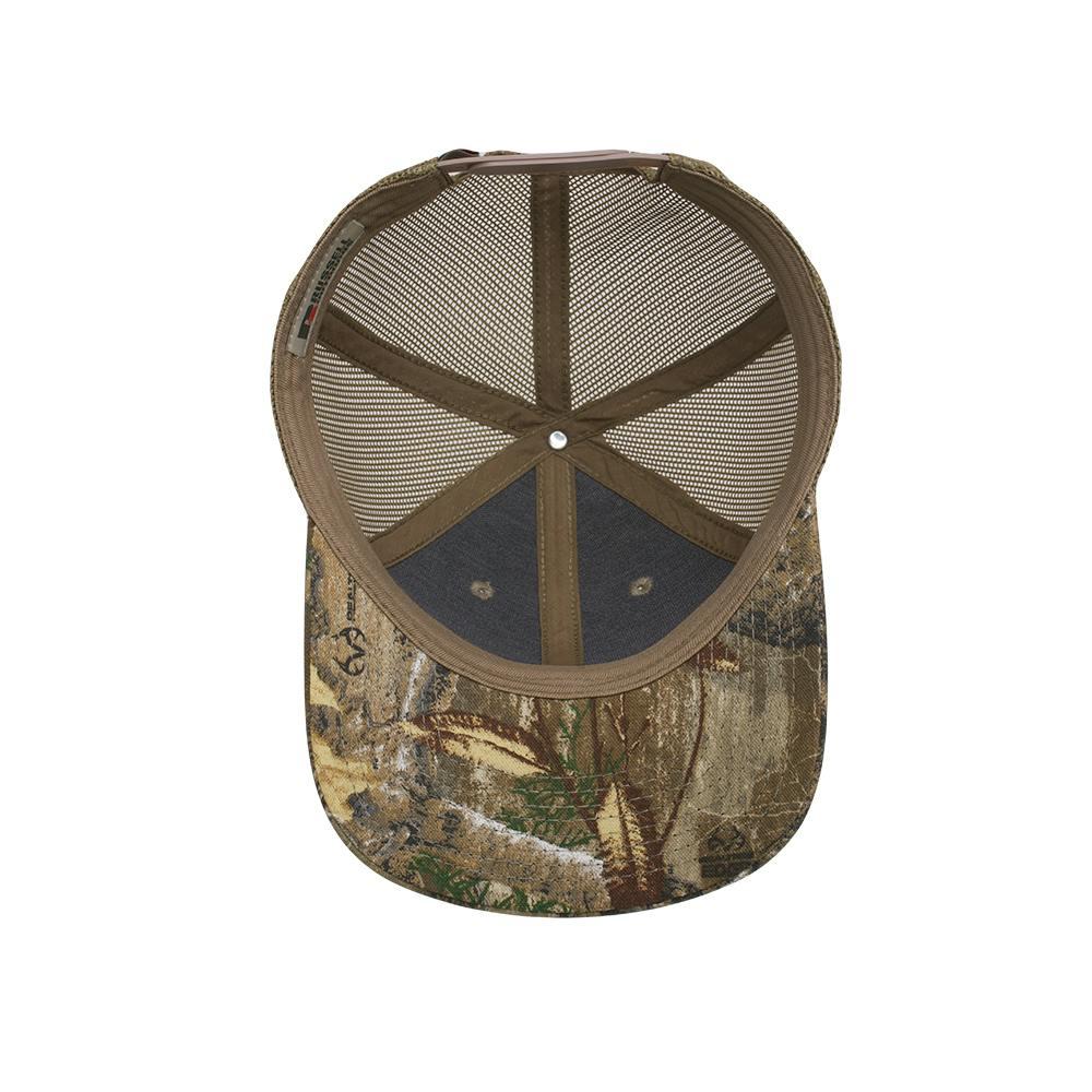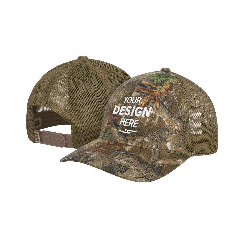 Russell Outdoors Camo Snapback Trucker Cap — a rugged, customizable camo snapback trucker cap designed for hunting, fishing, hiking and everyday outdoor wear. RealtreeEDGE® or Mossy Oak® prints on 100% brushed cotton twill front panels pair with breathable 100% polyester mesh mid/back panels to keep you cool and camouflaged. The structured, mid-profile fit and curved bill deliver classic style and sun protection, while a 7-position adjustable snapback closure ensures a secure, comfortable fit. Great as promotional gear or team swag — personalize with your logo or artwork for memorable outdoor branding.