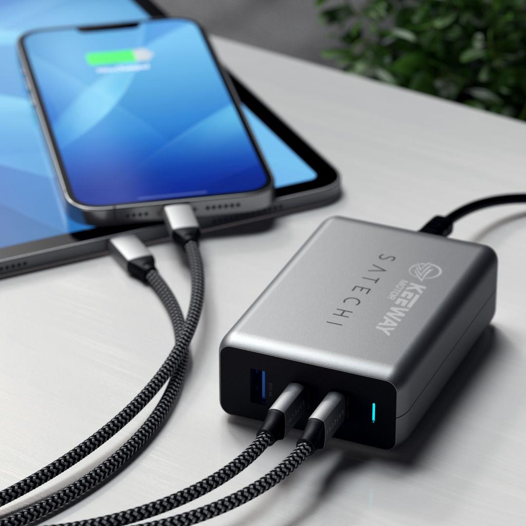 Charge everything faster with the Satechi 100W USB-C PD Compact GaN Charger, a powerful all-in-one solution built for modern devices. Powered by next-generation GaN technology, this compact charger delivers high-speed, efficient charging in a smaller, travel-friendly design—perfect for home offices, workstations, and life on the go. With two USB-C Power Delivery ports and one USB-A port, it intelligently distributes power to deliver up to 100W total output, replacing multiple bulky adapters. Ideal for laptops, tablets, smartphones, and USB-C accessories, this sleek charger keeps your setup clean, organized, and fully powered wherever you plug in.