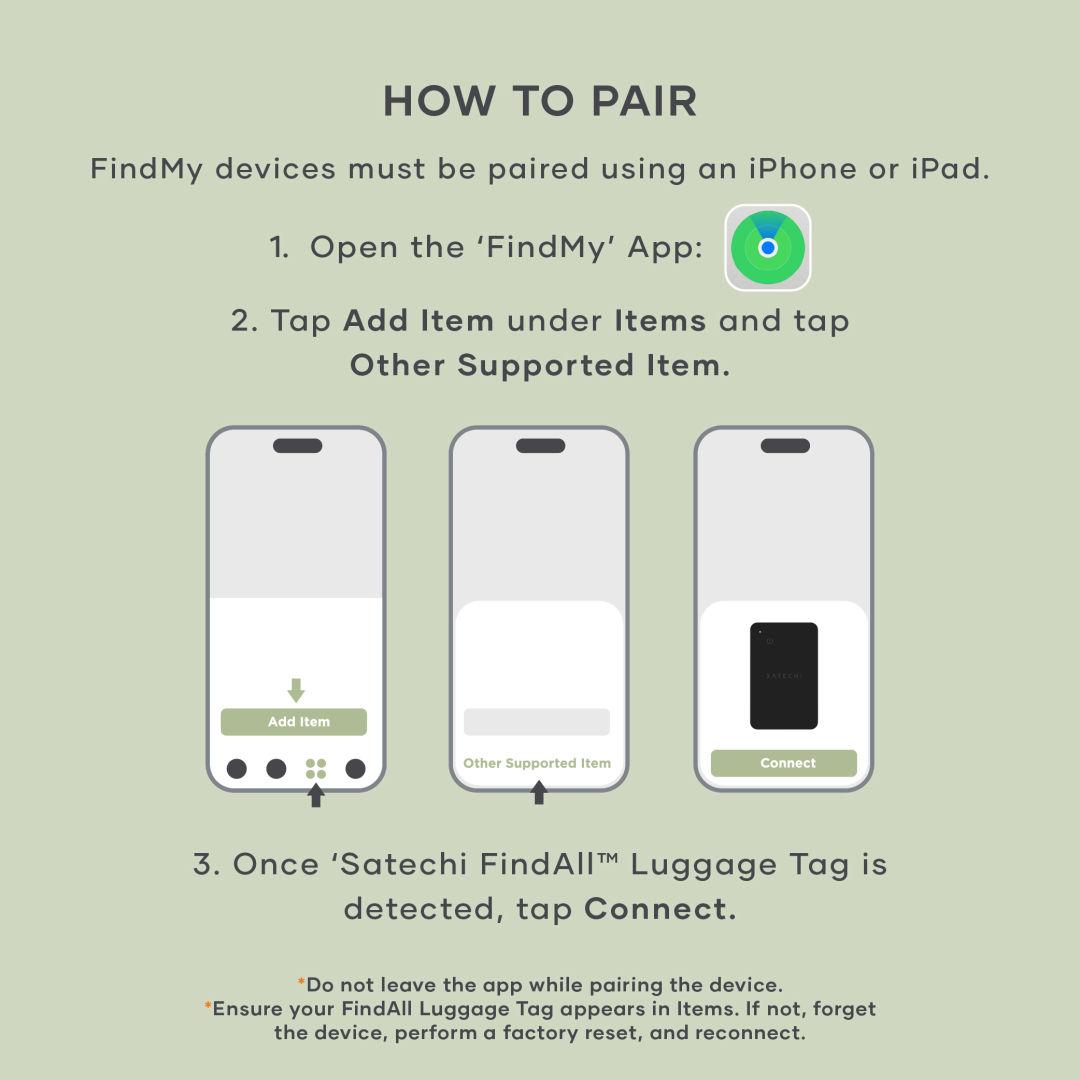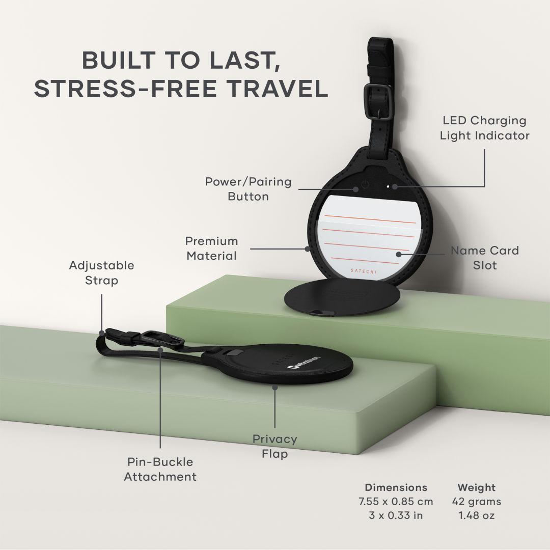 Travel with confidence using the Satechi FindAll™ Luggage Tag, a premium accessory designed to keep your bags secure and easy to find. Featuring Apple Find My technology (MFi certified), it helps you locate misplaced luggage quickly and sends left-behind alerts so you can stay one step ahead while traveling. Built from sleek, durable materials and powered by a wirelessly rechargeable battery, this luggage tag delivers reliable performance trip after trip. With Bluetooth® 5.4 LE for fast, accurate tracking indoors and outdoors, it’s ideal for air travel, business trips, and everyday commuting. Available in Black, Desert Rose, and Sand. (Apple devices only; not compatible with Android.)