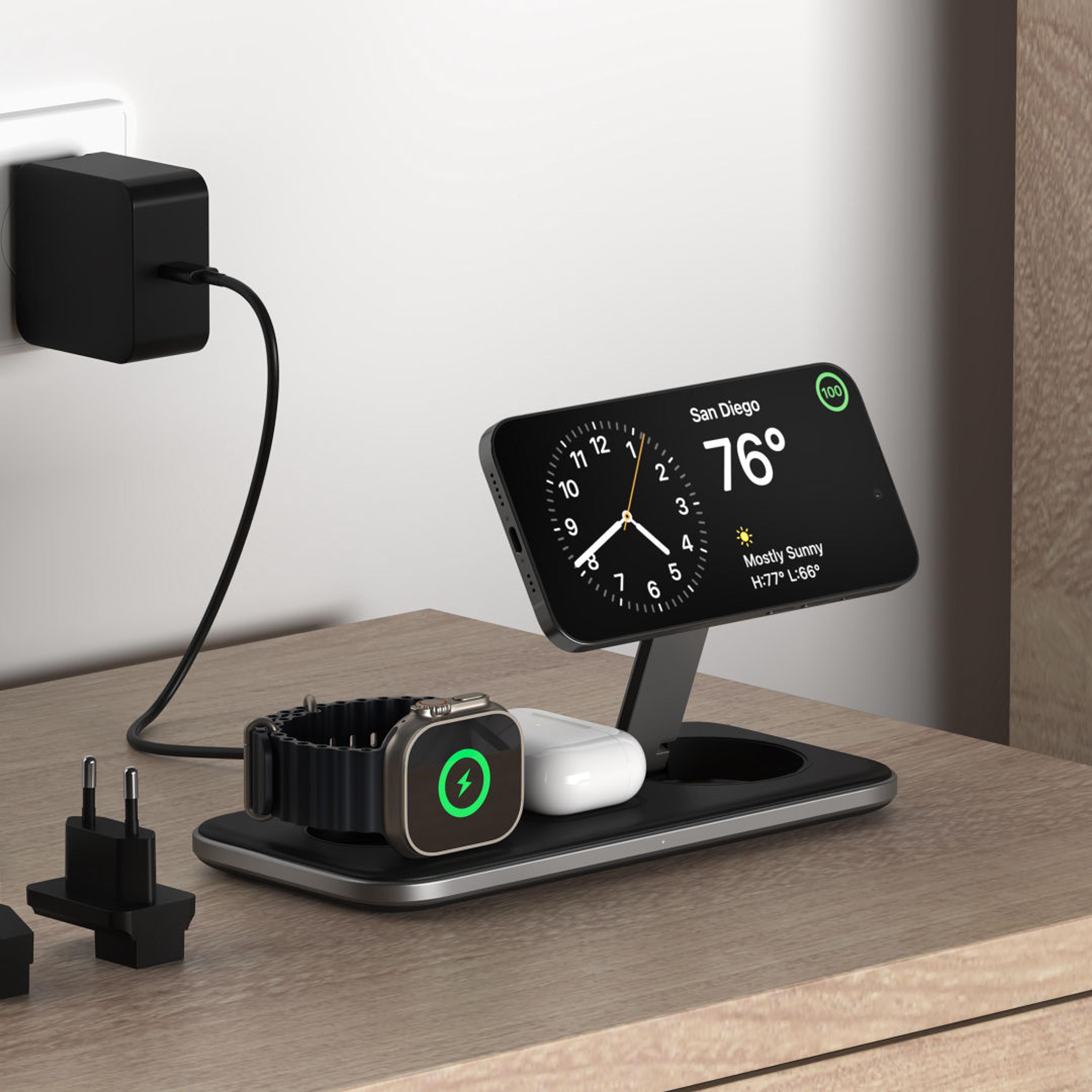 Simplify your charging setup with the Satechi Qi2 Trio Wireless Charging Pad, a sleek 3-in-1 solution designed for Apple users. Powered by the latest Qi2 technology, it delivers up to 15W fast wireless charging for iPhone, 5W for AirPods, and fast charging for Apple Watch—all at the same time. Built for both travel and everyday use, this foldable charger features a premium aluminum enclosure, vegan-leather base for stability, and a soft silicone charging puck to protect your devices. Compact and refined, it keeps your space organized while powering all your Apple essentials with ease. (Not compatible with Android devices.)