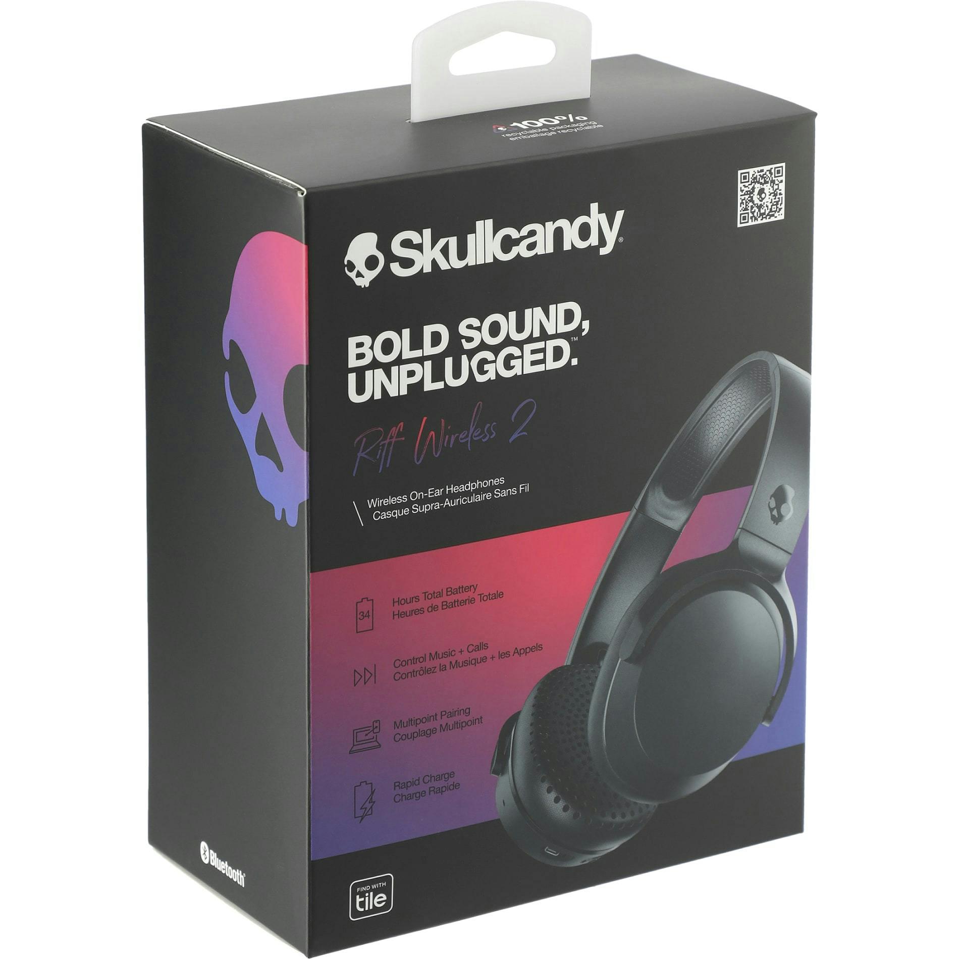 The Skullcandy® Riff 2 Bluetooth® Headphones can provide up to 34 hours of playback. The refined acoustic and custom EQ modes deliver a premium listening experience. The plush, oblong on-ear cushions provide all-day comfort. The built-in microphone, multipoint pairing (connect to multiple devices), low-latency gaming mode, and built-in music controls make them a great option for anywhere. Rapid Charging provides 4 hours of playback time in 10 minutes. A complete charge takes 2 hours. Includes removable 3.5mm aux cable and Type-C charging cable.