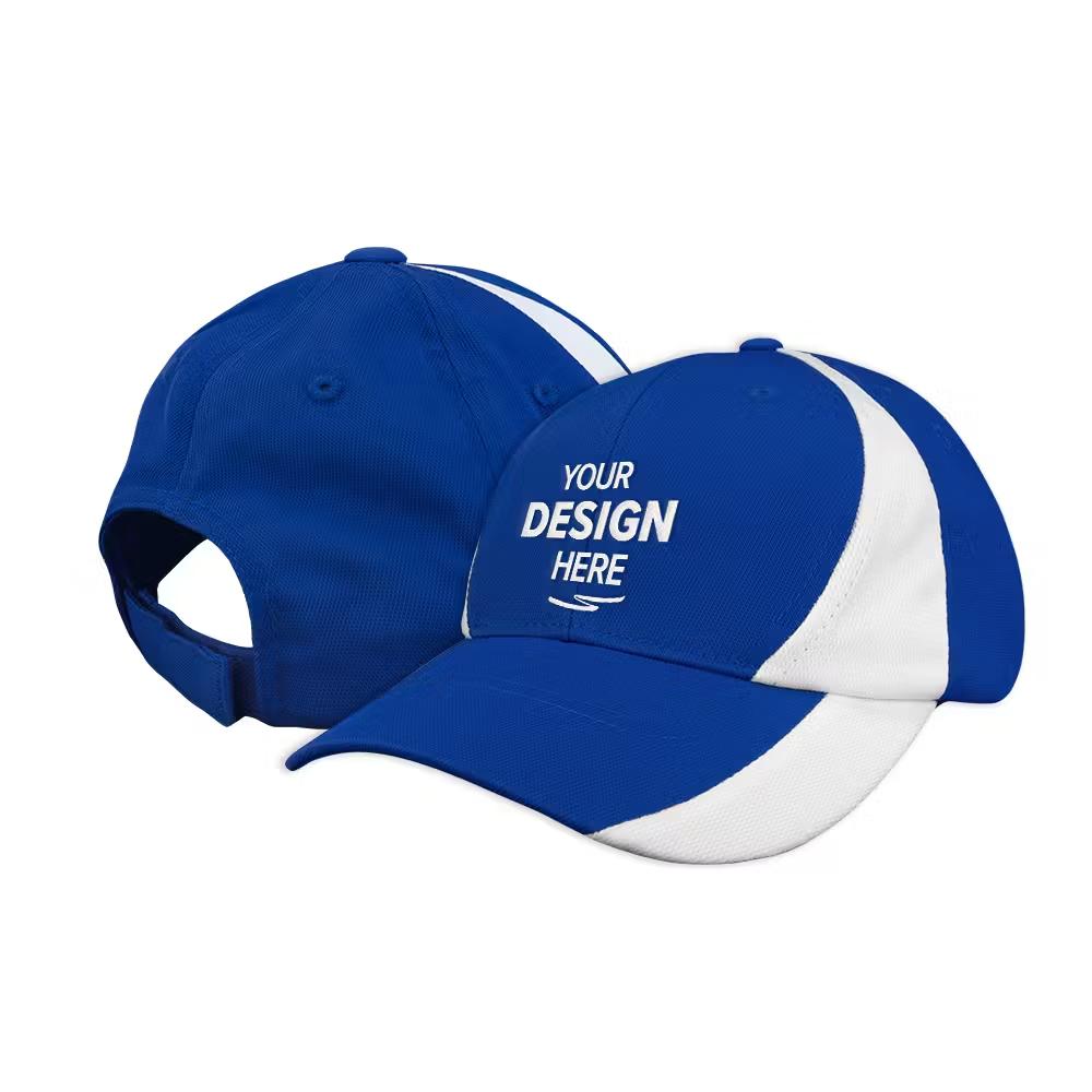 Sporty color blocking and moisture-wicking properties make this cap an all-around performer. The mesh insets increase the breathability factor when worn. This hat is great for sports team wear and uniforms.