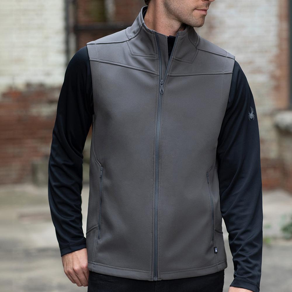 The Spyder Touring Vest blends performance and polish — a flexible stretch polyester/elastane double weave with a brushed interior of recycled polyester for next-to-skin comfort and lightweight warmth. Weather-minded details like an exposed reverse coil zipper with internal draft flap, zippered hand pockets and hem cinch-cord keep wind and chill at bay while forward-set shoulder seams enhance mobility for hiking, commuting or on-course layering. Finished with the iconic Spyder bug flag and high‑definition rubberized wordmark at center back, it’s an ideal customizable vest — add your logo or artwork for branded outerwear, team uniforms, or promotional giveaways.
