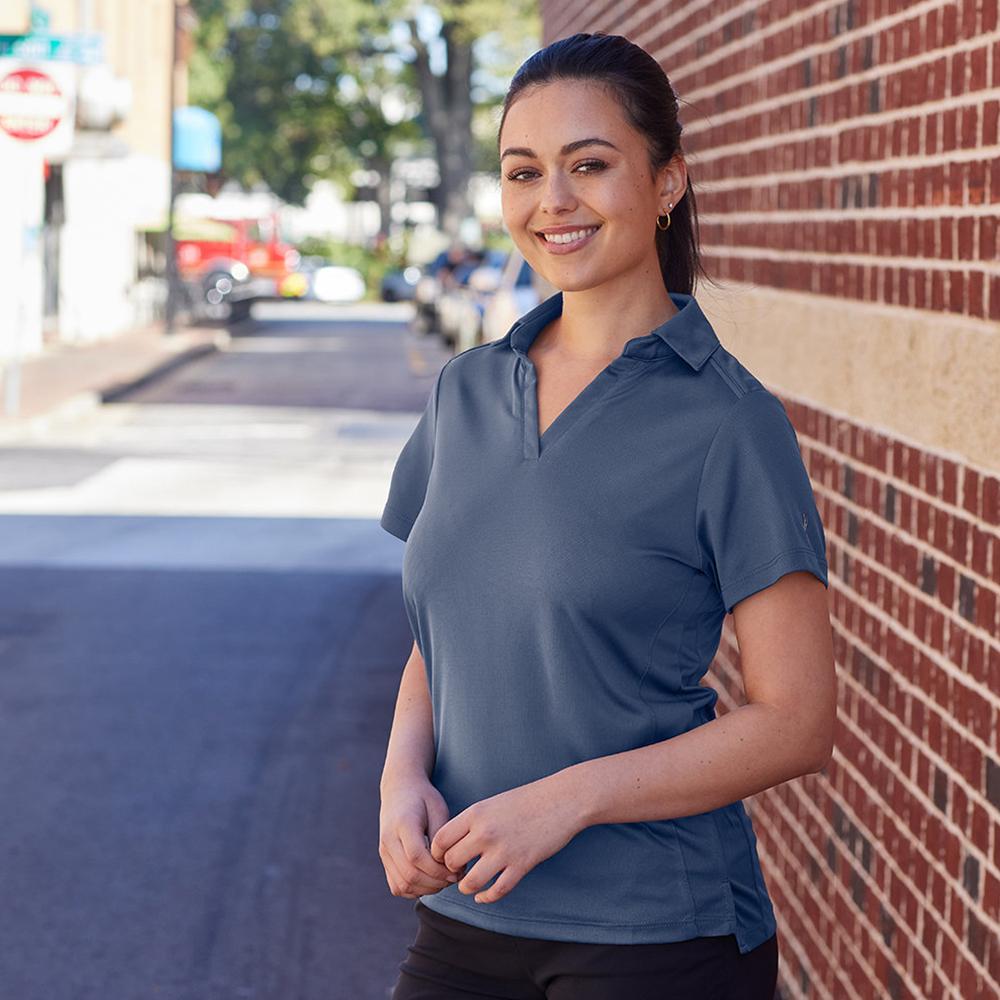 This Spyder Women's Freestyle Polo combines functionality with style using polyester textured mesh for breathability. It features a stylized open placket with heat-seal tape set into the shoulder seams, enhancing both durability and design. The polo includes the iconic Spyder bug logo on the wearer's left sleeve and Spyder branding on the back neckline. With side vents and a drop tail hem for added comfort, along with angled princess seams for a flattering fit, this polo offers a modern and sleek silhouette. Simply add your design or artwork to create on of your very own!
