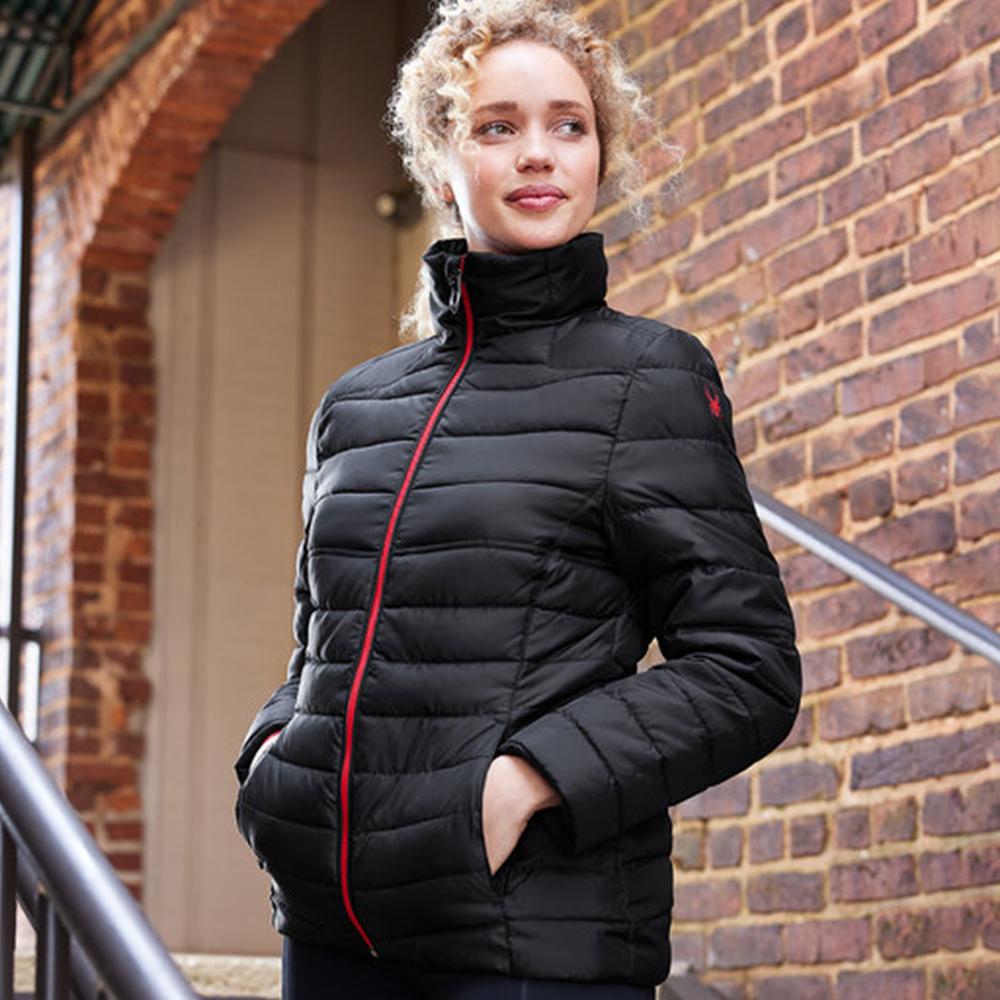 The Spyder Women's Insulated Puffer Jacket is crafted from durable polyester nail head weave fabric with synthetic down insulation for optimal warmth. It features a micro-brushed tricot inner collar for added comfort and invisible zipper inside the chest for embroidery access. Designed with princess seams for a flattering feminine silhouette, the jacket also includes zippered handwarmer pockets inset into the seams. Its modern fit ensures a stylish and snug look, perfect for cold-weather wear. Create your very own with a design or artwork!