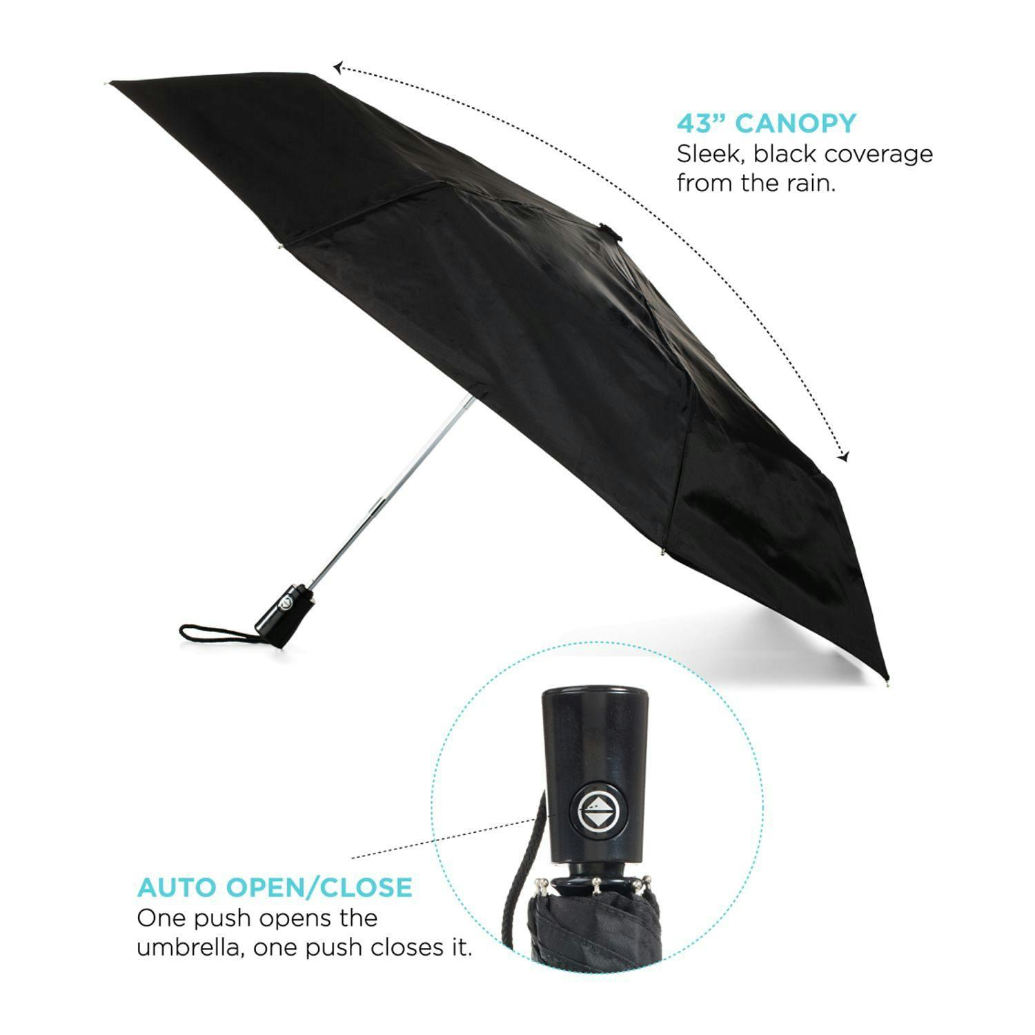 Opens and closes with the press of a button making it hassle free to get in and out of your car and into your home or workplace. Full size canopy rain umbrella. Opens to a 44 inch canopy arc. Modern handle design with a pop of color features ergonomic handle for secure comfortable grip. Includes carrying strap for convenience. Comes with totes® limited lifetime umbrella warranty. Available for one-day turn with Sureship®.