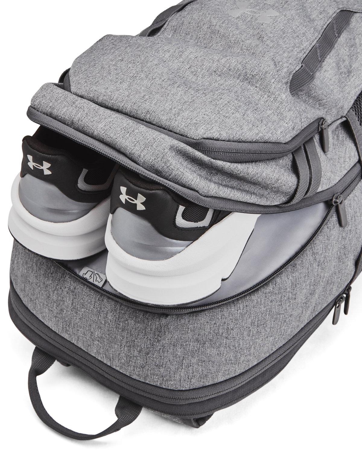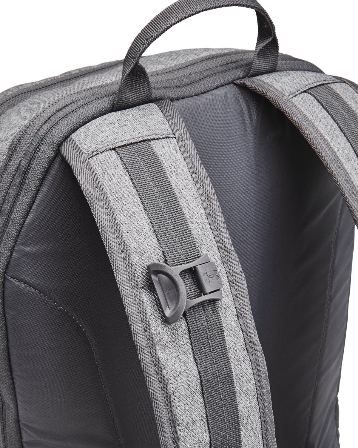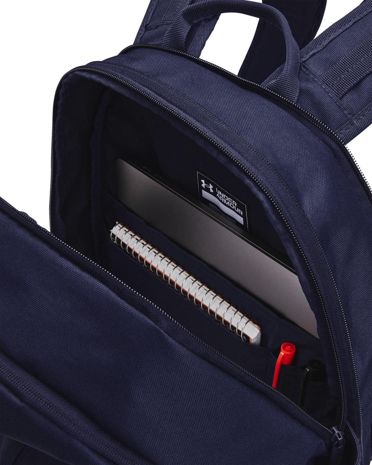 The Under Armour Hustle Backpack 6.0 is made from a durable blend of polyester and nylon, featuring UA Storm Technology for exceptional water and stain resistance. It includes a soft-lined laptop sleeve that accommodates up to a 16" laptop and a fully expandable main compartment for all your gear. Secure zip front pockets and a side pocket fit a 32oz water bottle, while the EVELED strap system ensures balanced weight distribution. Additional features include an adjustable UA strap clip and Molle webbing for extra attachment points.