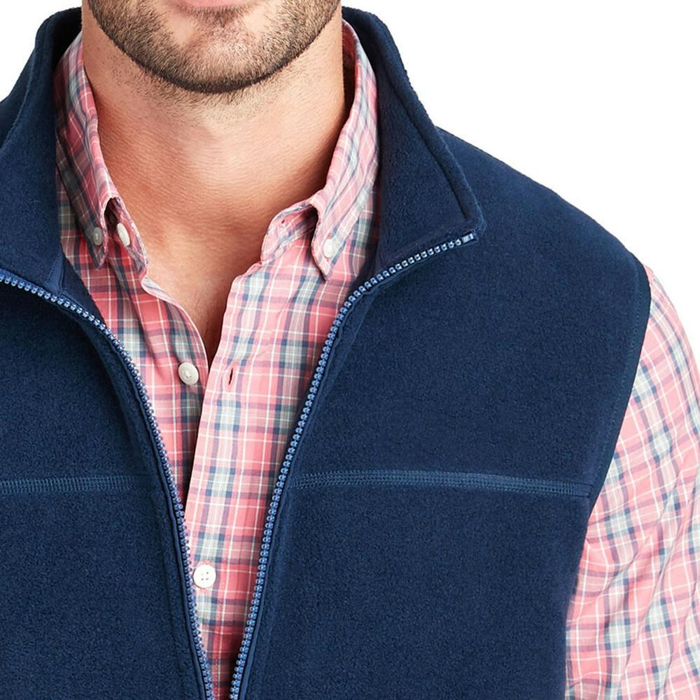 Introducing the Vineyard Vines Tech Fleece Harbor Vest: full-zip front, stretch binding at the hem, and armholes to prevent wear and tear. It has breathable mesh pockets to hold a phone, keys, wallet, etc. The stretch binding at the hem and armholes is designed to prevent wear and tear. With the iconic whale logo embroidered at the back neck and made from recycled fabric, this vest, it's both sustainable and a staple.