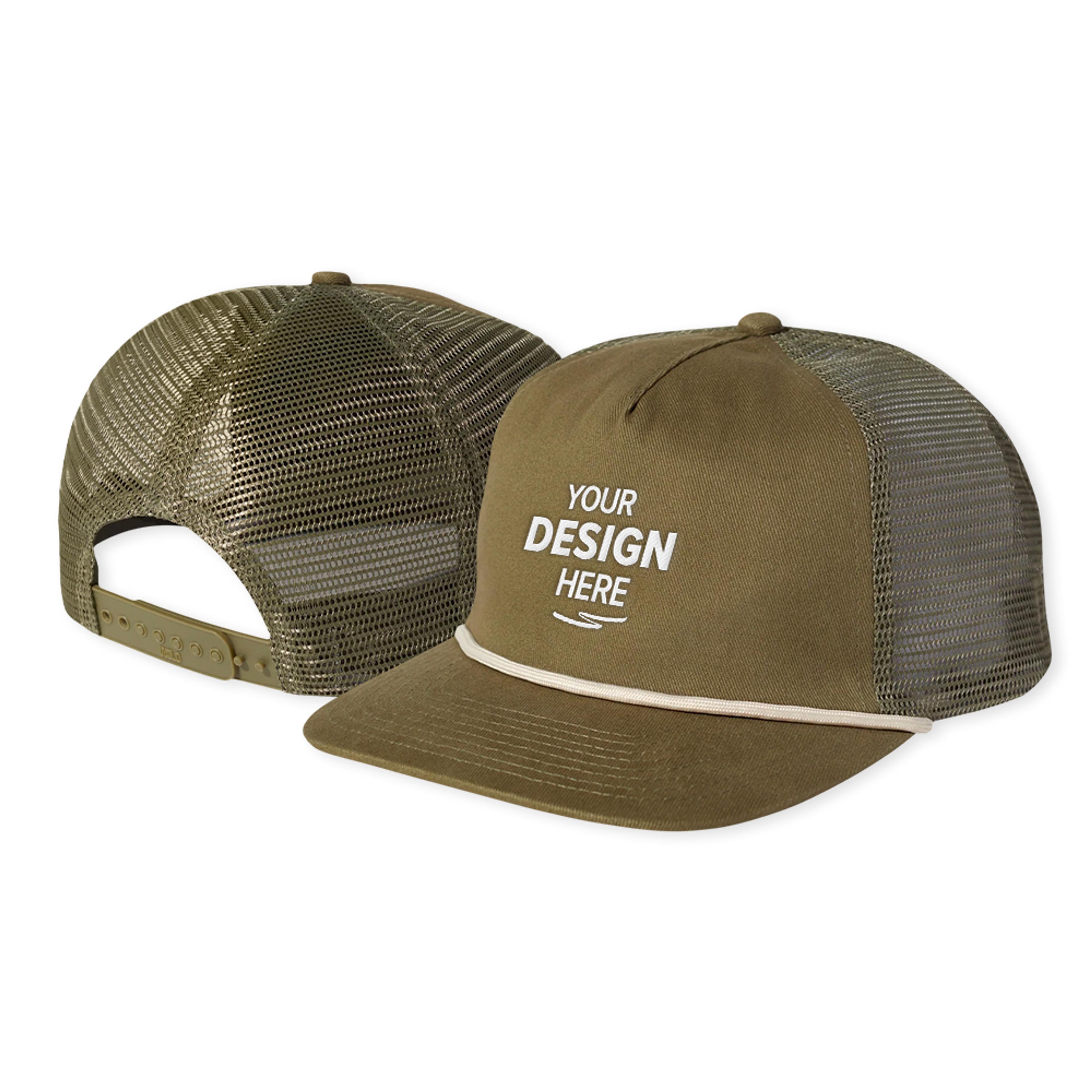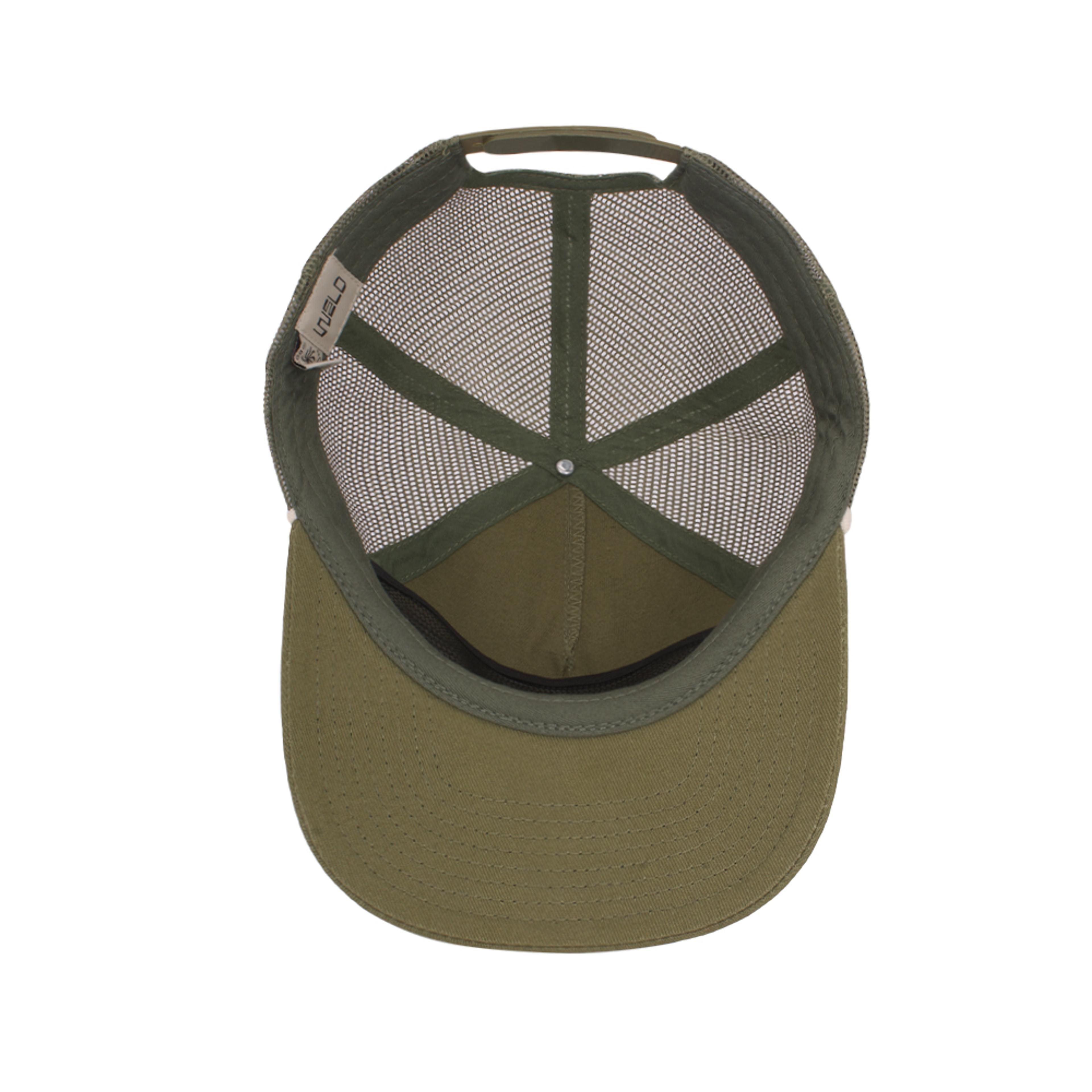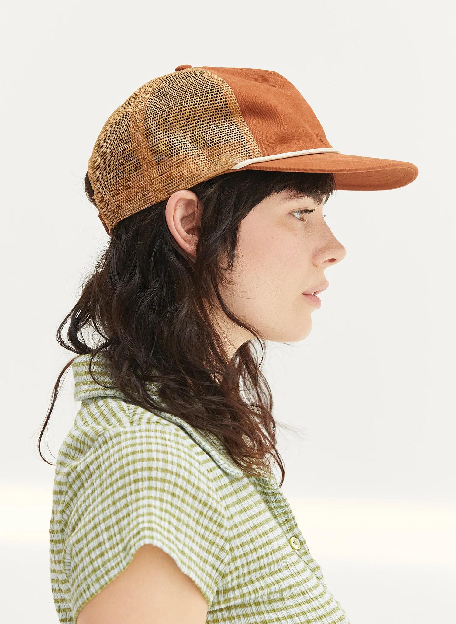 This 5-panel trucker hat was built with WELD MFG's Field Trip Hat's (FTB-005) crown. There is a mesh liner behind the front panels to help maintain the shape of the soft 100% cotton fabric. The brim is the same size but has a slight curve and features a rope. Its build is derived from the nostalgia of vintage workwear hats. One size fits most with an adjustable snapback closure.