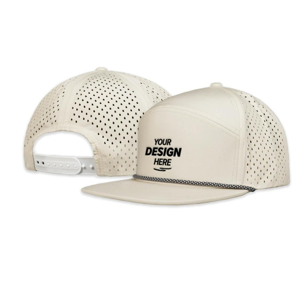 Zapped Headwear Osprey R+ Hat — a premium custom 7-panel rope hat that blends rugged function with signature style. Water-repellent outer shell keeps you dry, while a perforated, sweat-absorbing sweatband and breathable polyester backing deliver all-day comfort. Features a fully customizable, sewn-on engraved leather patch and classic sewn rope brim over a flat-bill, medium-profile crown. Comfortable spandex blend with a structured polyester/cotton face and one-size-fits-most snapback. Perfect for promotional giveaways, team apparel, outdoor events, or a military tribute — add your logo or artwork to create a standout custom snapback.