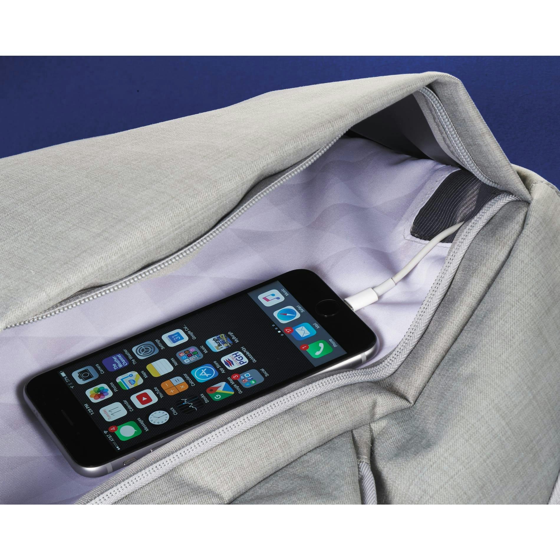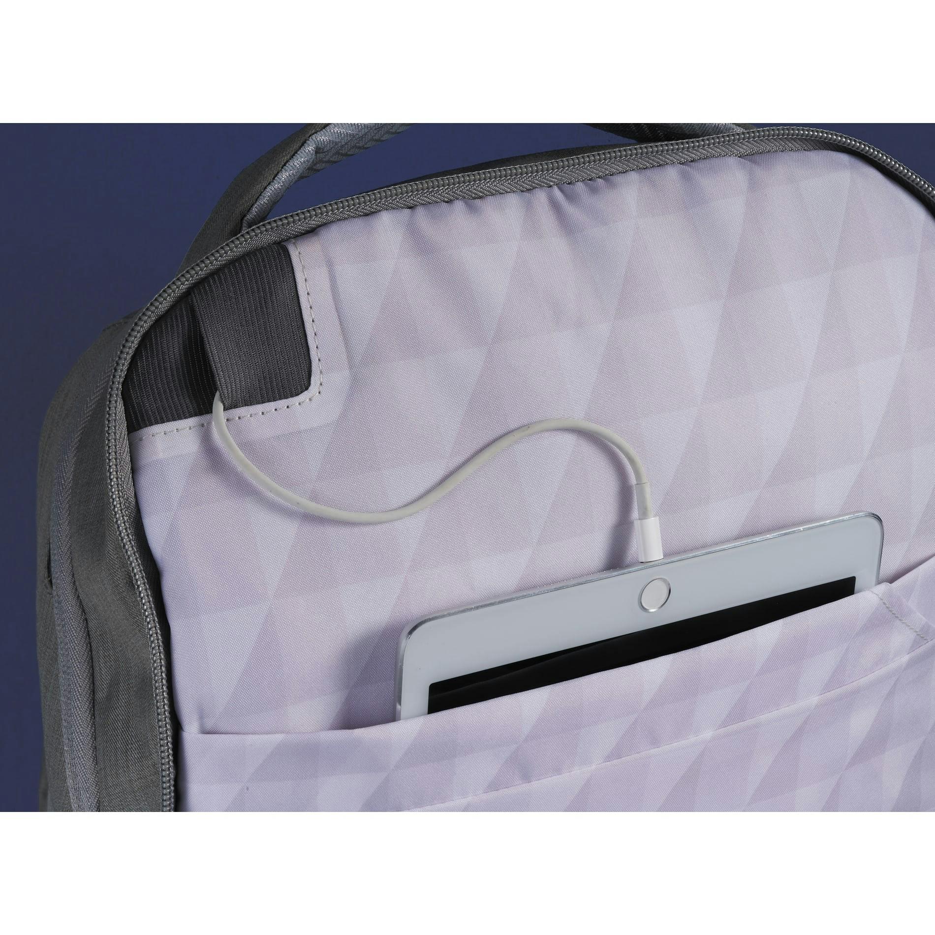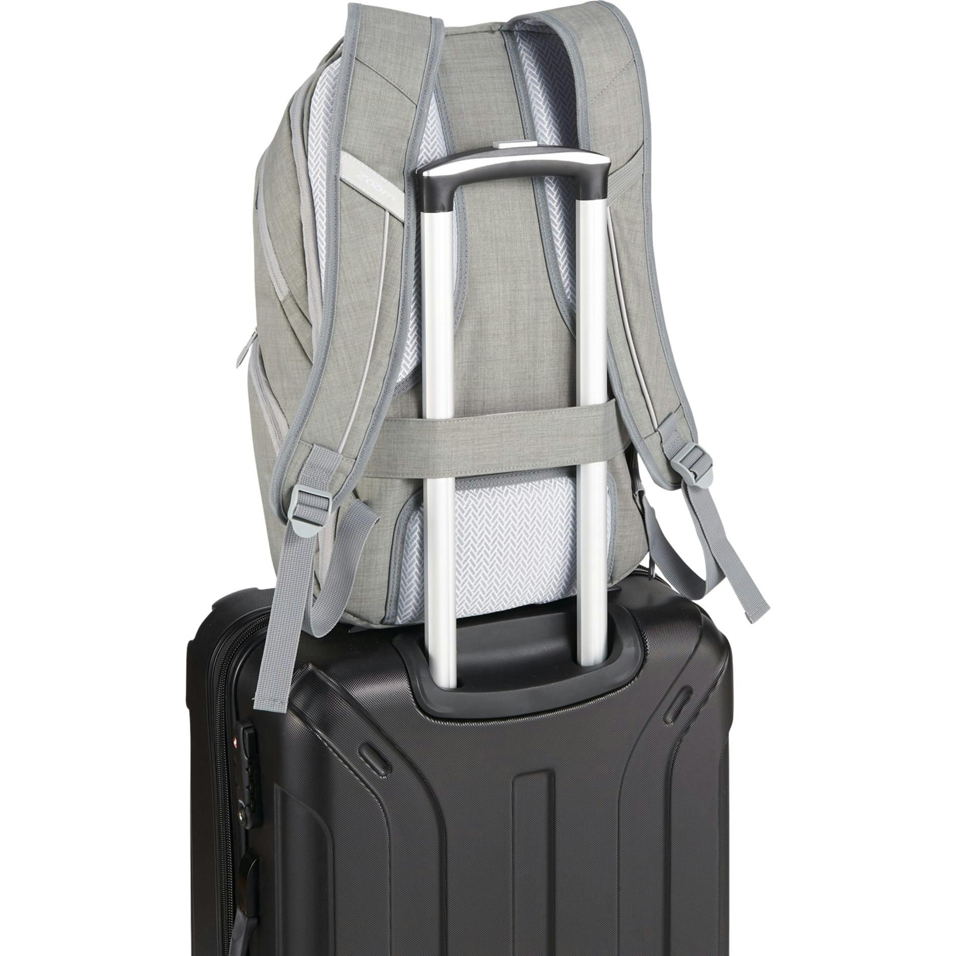 The Zoom® Grid 15" TSA Computer Backpack works to provide you the accessories you need for the technology you use every day. Sleek heathered gray material with gray/silver accents. Signature Zoom lining and cord pass through. Main compartment features a tablet sleeve and a mesh organizer pocket. Padded rear TSA laptop compartment for laptops up to 15.6 inches. Padded back and shoulder straps with trolley sleeve. Zoom branding and accents.