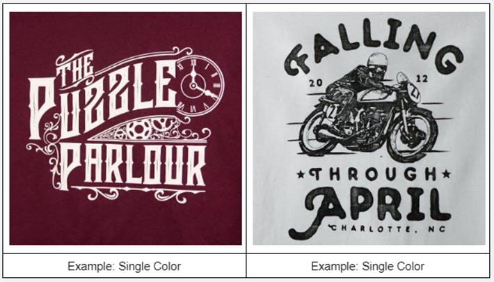 The application of a single ink color to a garment is "single color printing." Also known as one-color printing, it’s ideal for simple designs and is among the most affordable color options.