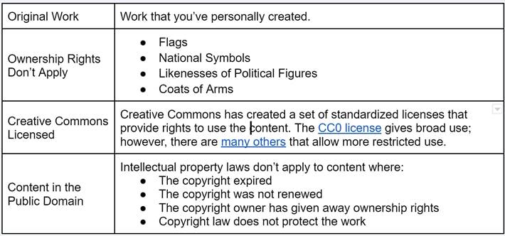 Copyright protects original works of authorship as soon as the creator develops a piece of work in a tangible medium. Common types of materials include: