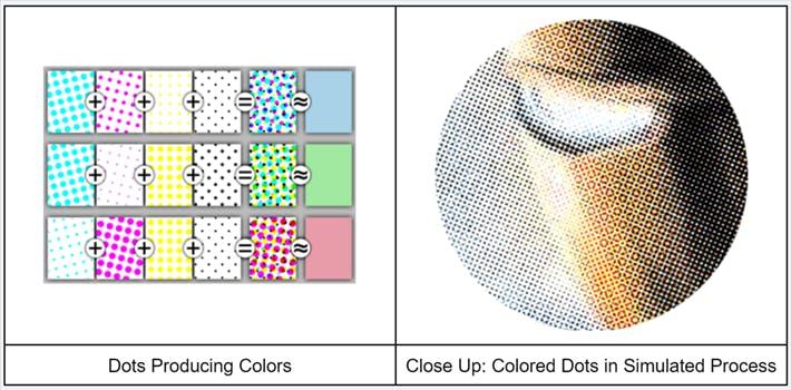 Simulated Process produces color by applying Halftones of spot colors. A spot color is an individual color; it’s not produced by mixing process colors (CMYK) and is much more consistent. The resulting print produces tiny dots that are blended into a continuous tone, full-color image by the human eye.
