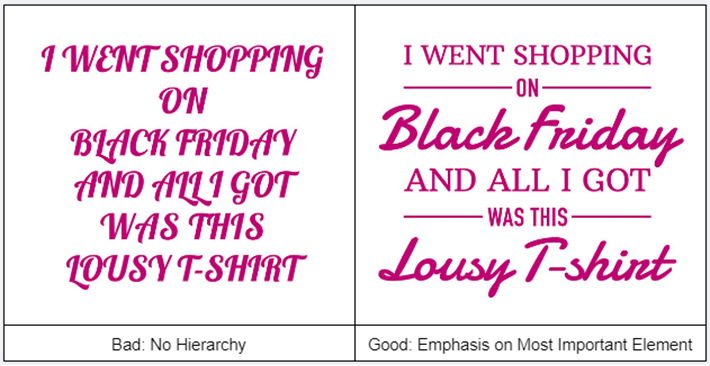 A visual hierarchy identifies the most important elements in a design and the selection of appropriate fonts is important. Also used with images and graphic elements, visual hierarchy can be communicated with fonts by: