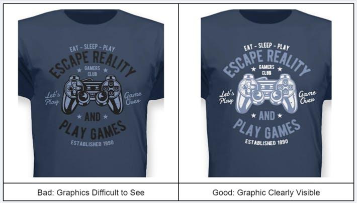 Contrast is the ability to clearly see the contents of a design by using different colors, so if visibility of the elements is important to make sure that they stand out. Issues can often occur when the coloring of design elements is too similar to the color of the underlying shirt.