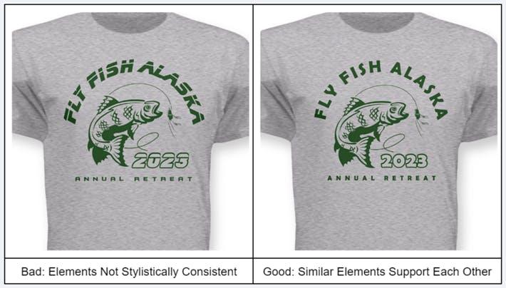 When assembling the elements of your design, use photos, fonts, and effects that complement each other. For example, a wild west themed shirt design could use photography with a sepia tone color palette (common to antique photos), an old west font like Gold Rush, and a distressed effect to the design to give it age. Each of these elements complements the other and produces a design that many will be seen as thematically consistent with the theme: Wild West.